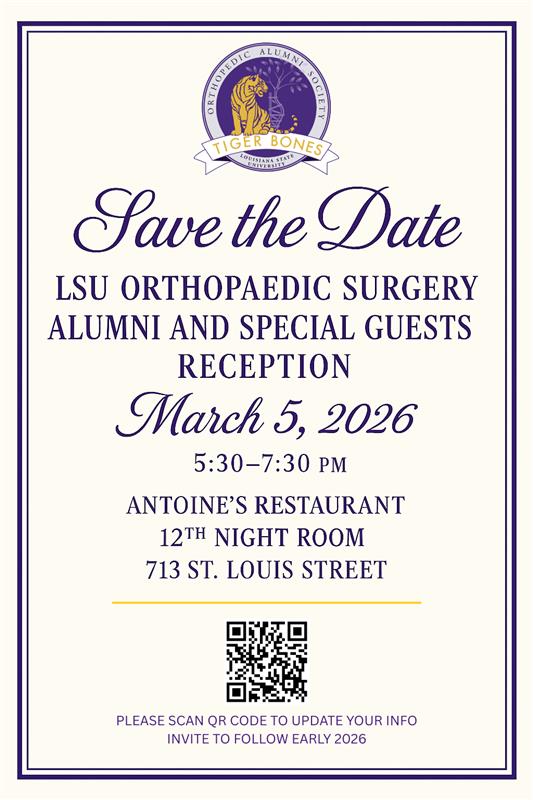 In lieu of the annual Tiger Bones Dinner, the department will be hosting a cocktail reception at Antoine’s restaurant. We’re asking all LSU Ortho Alumni and friends donate $250 or more to Tiger Bones this year.